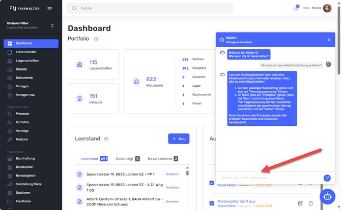 Schreiben Sie die Fragen, welche Sie zur Anwendung von Fairwalter beantwortet hätten, in das Chat-Fenster. Walter wird Ihnen diese dann so gut wie möglich beantworten. Berücksichtigen Sie aber, dass Walter nur auf Fragen zur Anwendung von Fairwalter ausgerichtet ist.