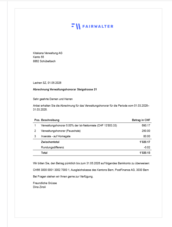Das Verwaltungshonorar ist die Entschädigung für die Bewirtschaftung einer Liegenschaft. In Fairwalter wird diese Gebühr direkt aus den hinterlegten Prozentsätzen oder Pauschalbeträgen Ihrer Buchhaltungsdaten berechnet. Anstatt das Honorar manuell auszurechnen und eine externe Rechnung zu erstellen, generiert das System automatisch eine detaillierte Abrechnung inklusive der dazugehörigen Kreditorenrechnung. Auch können weitere Aufwände, wie zum Beispiel Inserate-Kosten, direkt an die Eigentümer verrechnet werden.